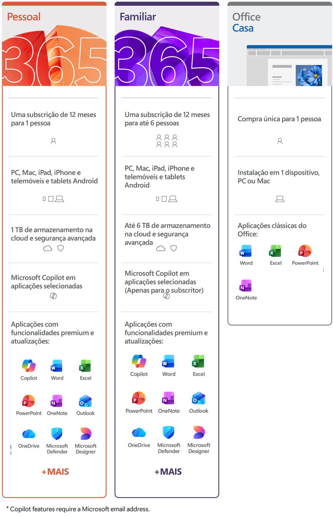 Em qualquer lugar e em qualquer altura, mantenha-se sempre atualizado com poderosas aplicações de produtividade e o Copilot[1] no Microsoft 365. Elabore documentos e emails[3], reescreva frases, resuma longas conversas por email, analise dados, e muito mais, de forma fácil.